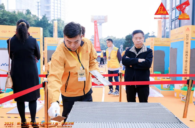 作為家裝行業的頂級技能賽事,西卡金工匠大賽以考核嚴苛著稱,本屆賽事吸引了全國數十家頭部企業的精英選手同臺競技。比賽采用現場實操的考核模式,裁判組從施工操作、膠漿厚度、表面平整度、縫寬均勻、灰漿飽滿度等幾個維度進行量化評分,任何一項指標偏差都會讓參賽師傅大幅失分。