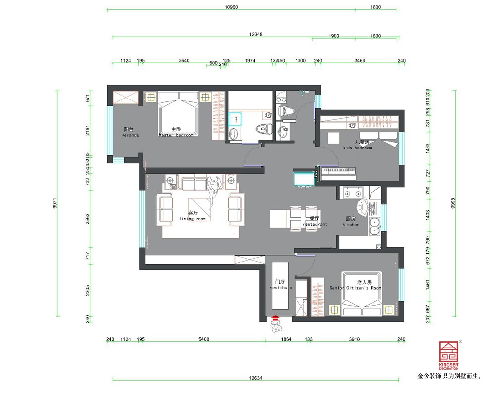 優化方案:餐廳做島臺餐桌組合,形成環島設計,并且島臺上做迎客松與空白掛畫借景設計,形成進門玄關,主衛做左右布局設計,更大的利用空間,客衛做干濕分區,使除主臥居住者,得到更合理的衛生間使用體驗。