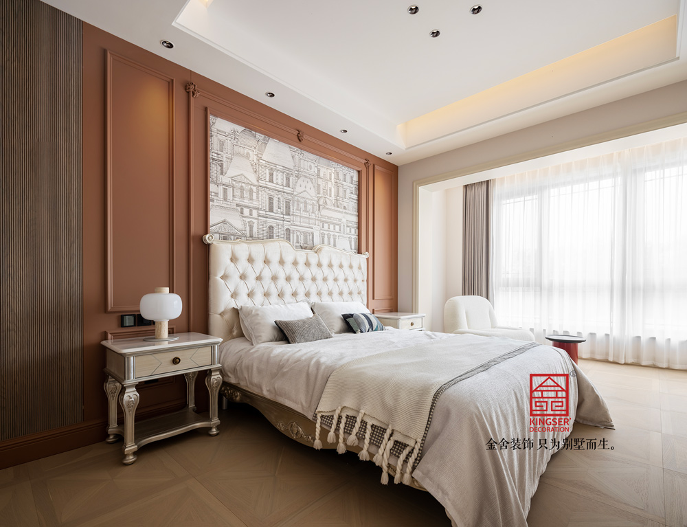 三樓主臥空間納入窗外四季風光意境,簡潔、舒適、寧靜,在這個臥室體現得淋漓盡致,設計就該更于回歸生活,并非不食煙火,而是剔除了方方面面的冗雜,以更鮮明更清晰的方式去表達出眼下的狀態。