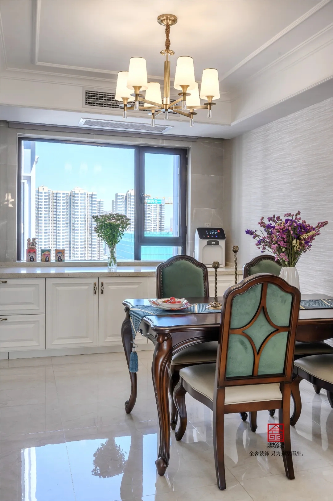 流暢線條帶起躍動的視覺體驗(yàn),簡潔而素雅的餐邊柜搭配深木色的餐桌椅,顯得高貴而具有