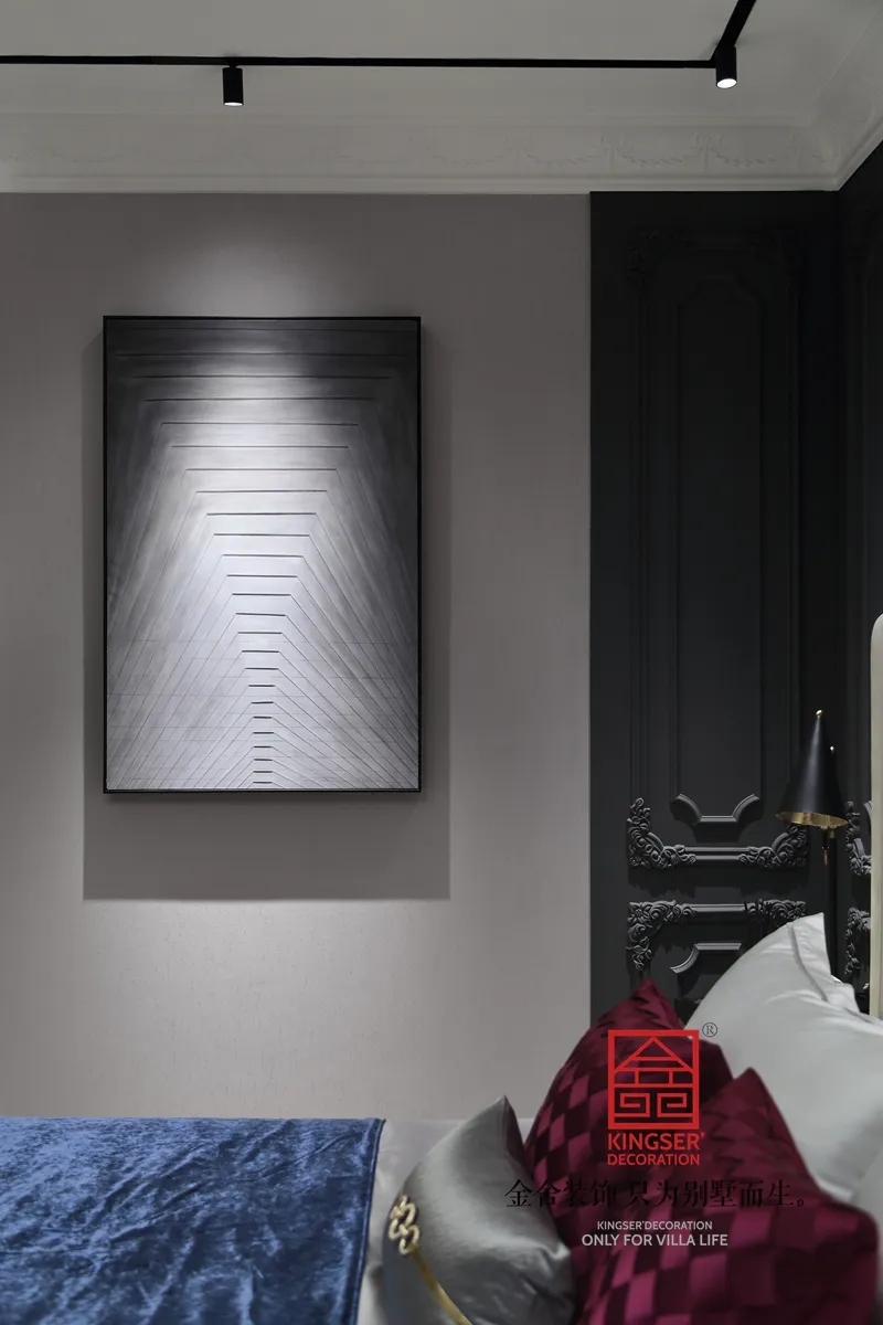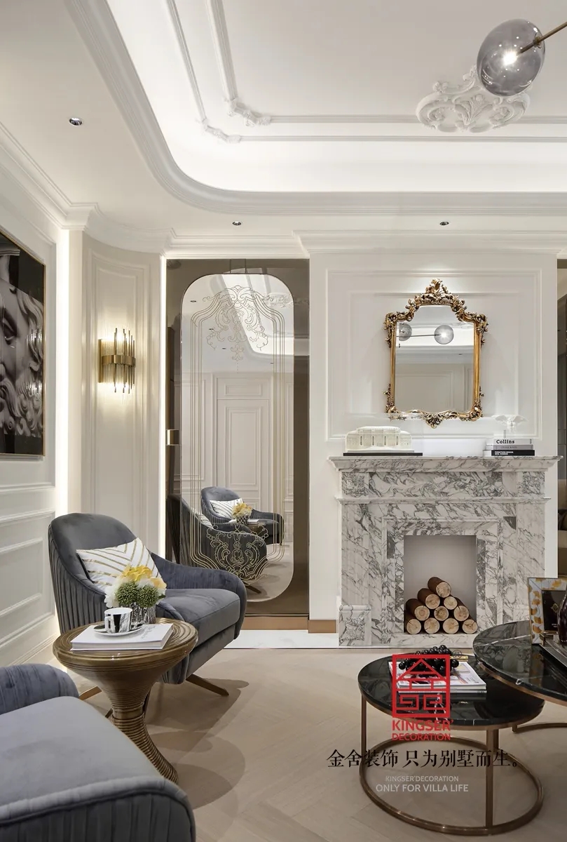 客廳背景墻以質(zhì)感的大理石壁爐與金屬的配色碰撞時(shí)尚冷色的美式風(fēng);而與之對(duì)應(yīng)的另一側(cè)則有溫馨感的中式山水寫意,時(shí)尚的黑白掛畫散發(fā)出一種迷人的氣息,灰色系的家具則與家居配飾完美的呼應(yīng)。