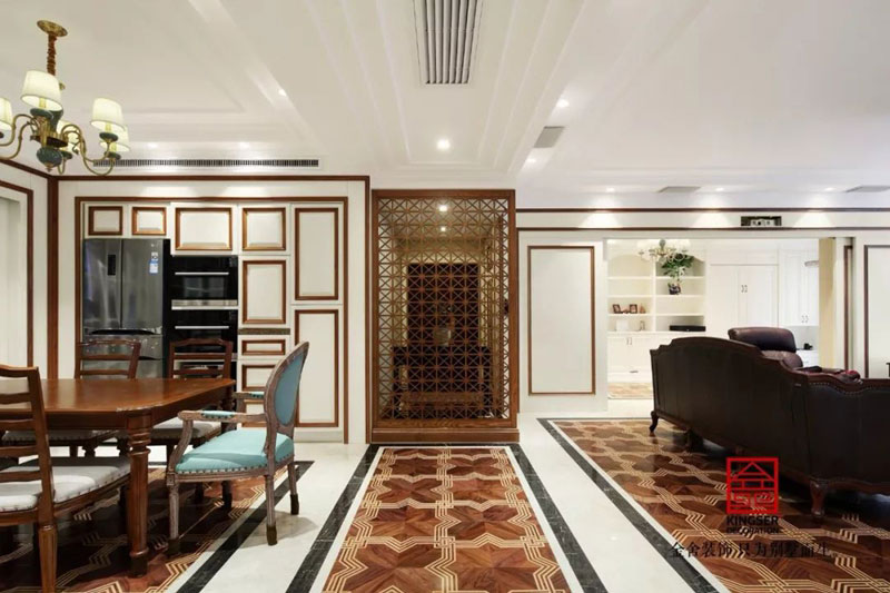 金舍裝飾~天海譽天下217㎡裝修簡約美式設計實景圖,美式風格在不斷的變化中有了其特有的味道,或者偏向于歐式,煥發出一種淡雅而清爽的感覺。或偏向于古典,在嚴肅中帶有一份時間的積淀。