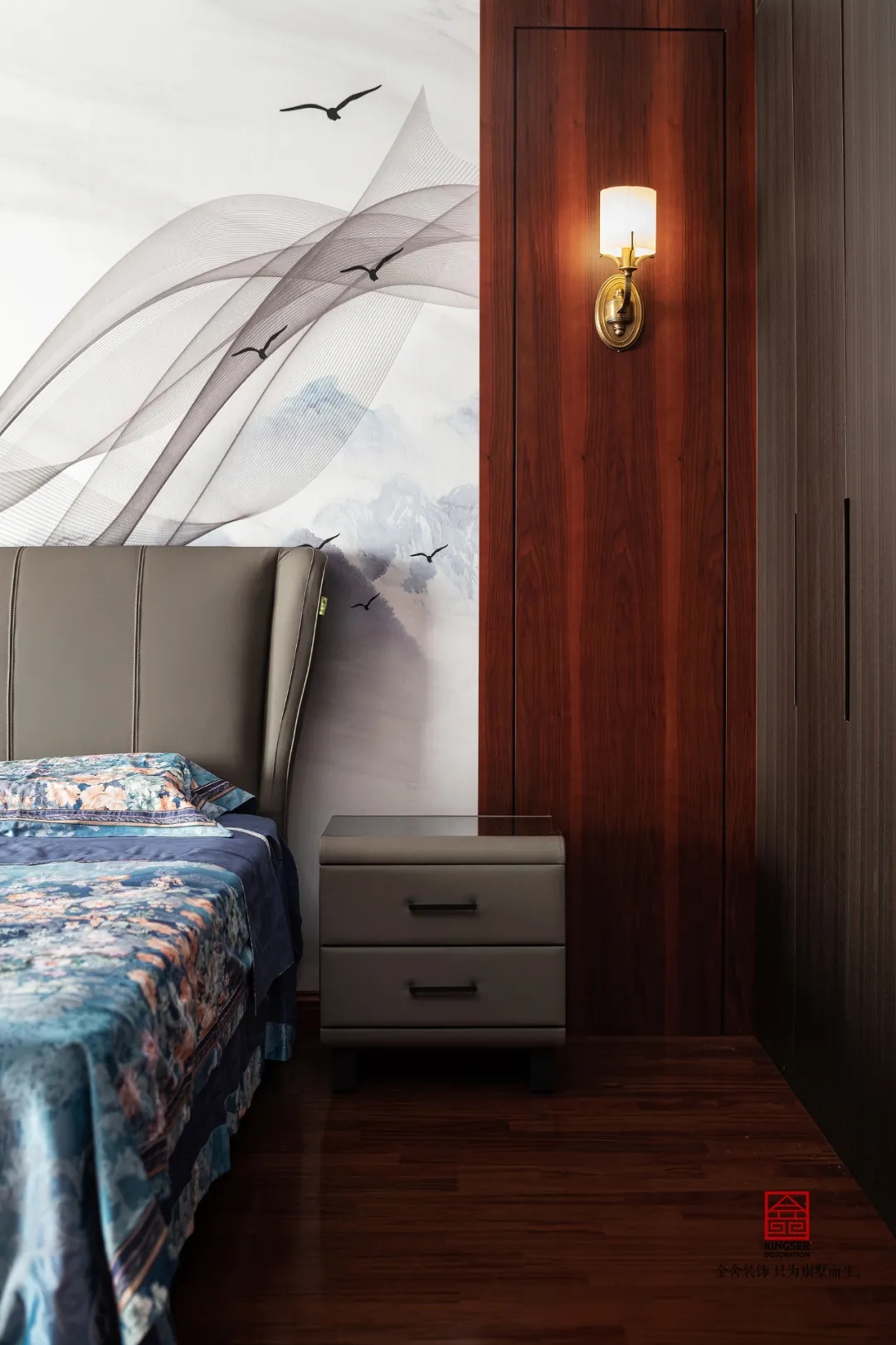此案例為金舍裝飾-大者別墅300平米新中式風格裝修實景。繽紛的世界,滿眼的山色。時常仰慕古人,可以把顏色分得如此細膩,連名字也起得那般富有詩意:翠為山色,碧為湖色,丹是云霞升騰。顏色,是渾然天成的畫,是生活經驗凝結成的詩,人們一見名字,便心領神會,在腦里生出了意境。