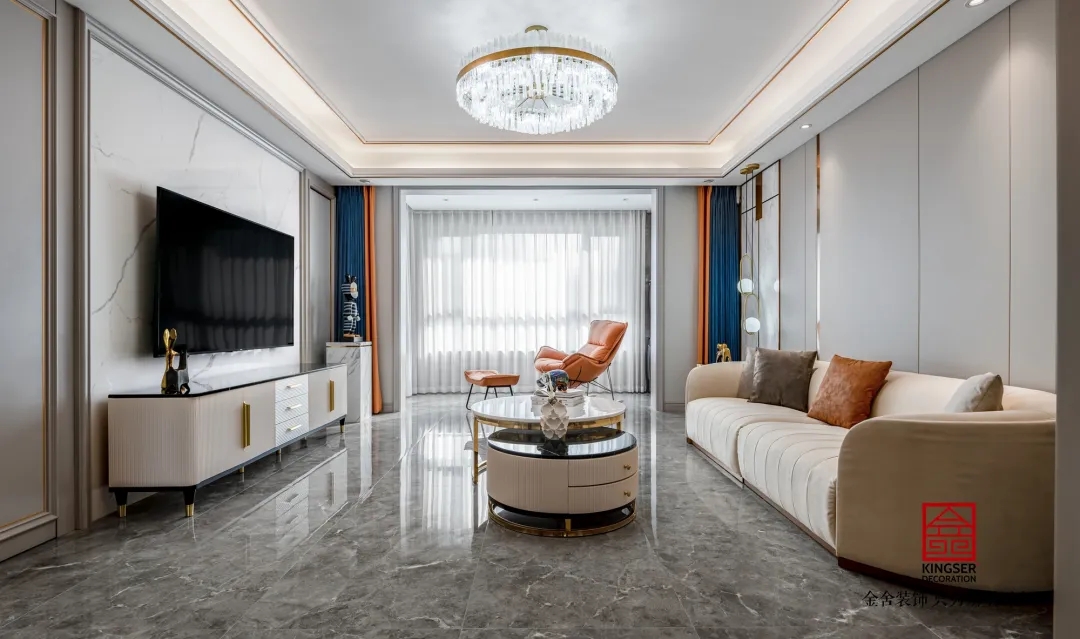 現代輕奢注重居室空間的布局相對平衡的空間打造舒緩的氣氛線條感打造居室的視覺延伸同時使用家具、布藝、色彩等客廳同時以開闊視野加上對現代設計色調的把握