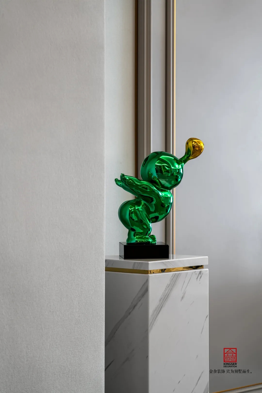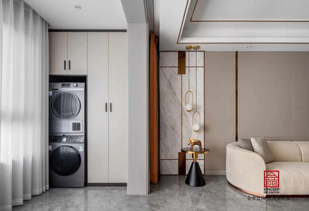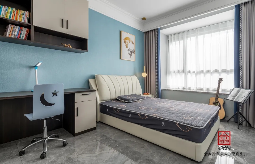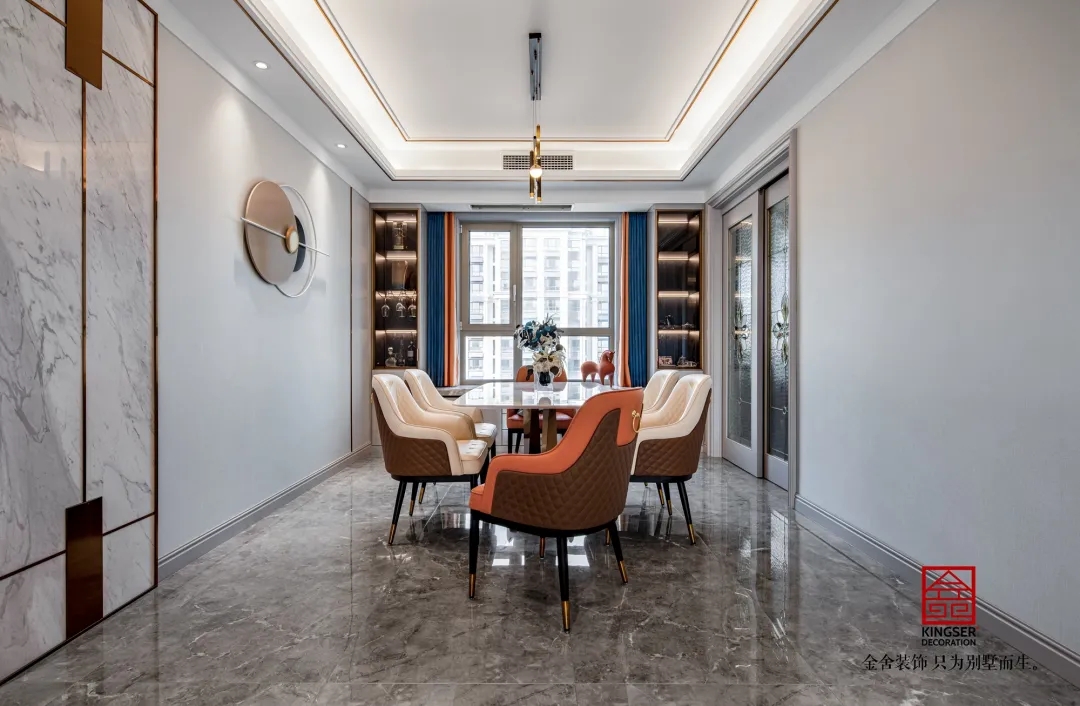 客廳改變了以往輕奢風格色彩單一的設計,空間中色彩的表現,講究顏色的搭配。藍色與橙色的對比讓整個家居的亮點不再單一和呆板,讓色彩引領空間的調性,才是色彩設計的初心所在。在灰度的空間中,那幾抹亮色呈現遞進式的鋪展,悄無聲息之中,營造出豐富的層次感,為空間注入生機與靈氣。
