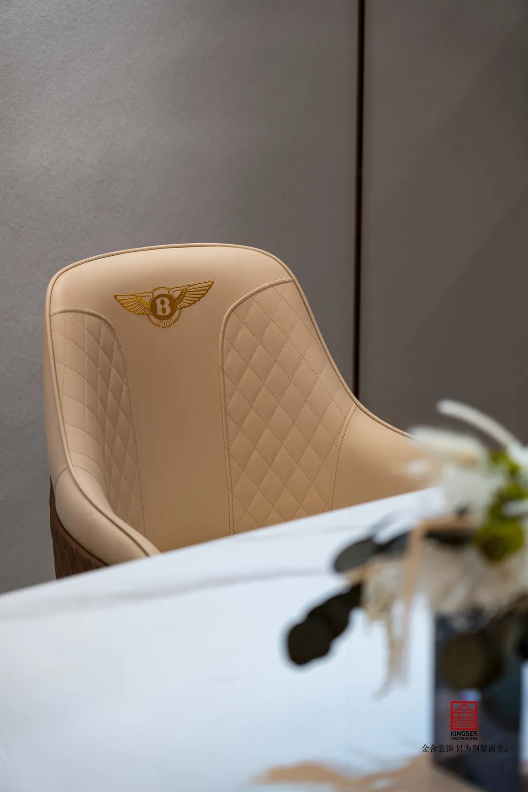 餐廳連通客廳,整個空間十分通透,陽光滿撒入餐廳之中,讓整個空間充滿幸福的氣息。軟皮質座椅,巖板餐桌,時尚的線條餐廳燈,同系的色彩與簡單的幾何線條,無一不在迎合整個空間的奢華格調。