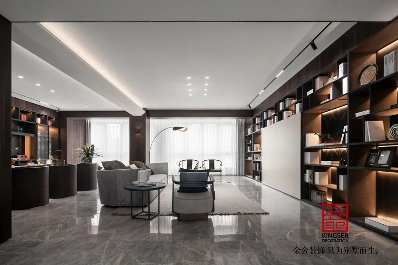 本案為御河上院210㎡新中式風格裝修實景。最大特色就是對于空間的拆改,擴大了空間,將原來的臥室跟客廳打通,建造成了一個巨大的客廳。一般半居家一半茶室,讓整個空間更具功能性,同時將整個家居的格調提升了一個很大的檔次。在風格中將傳統文化元素與現代生活所需完美結合,同時悉心考量主人性格情緒,自然地將中式味道中的力量呈現。