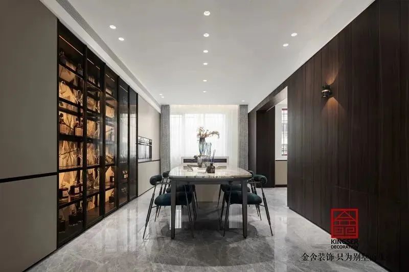 整體使用的顏色整體濃重而和諧。橫平豎直的空間線條里,質感木紋如墨色般暈染開來,木質、金屬、巖板等材質亦悄然置入,東方情韻與現代時尚的骨骼大膽融合,相得益彰。典雅高顏值,看得出設計師的優秀的能力與業主的不凡品味。