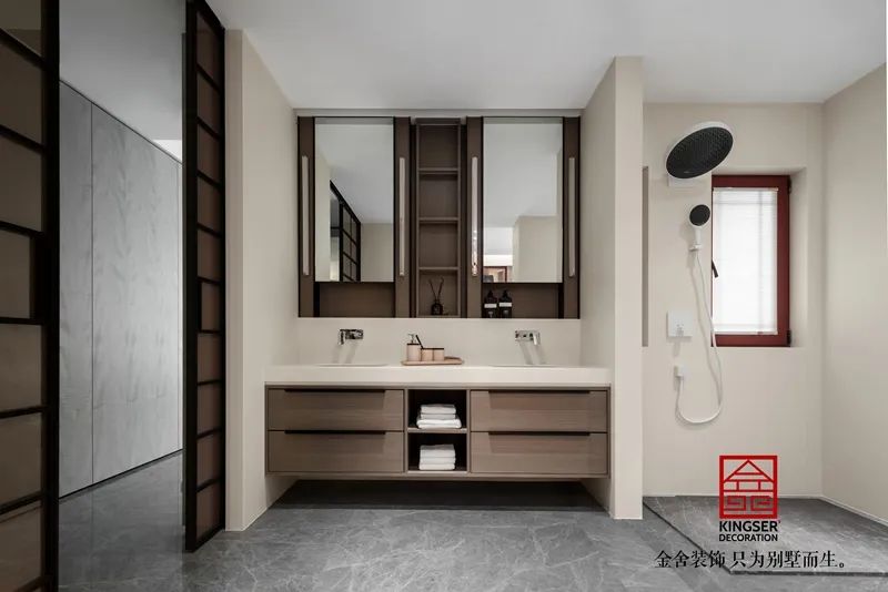 優美典雅感的水墨細描與傳統的中式家具,山水清新墻面畫作、蘊含著東方之美的“端正方整”之體態,傳統的木,傳統的風,端莊又不失風雅,窗外錯落的光影,打進來點點光束,生活莫過于此。契合女主人對于穿著和配搭的講究,特別在衣帽間的中央設置了一個中間的展示臺,一些奢侈品都可以在這里展示。同時也方便業主的取放。