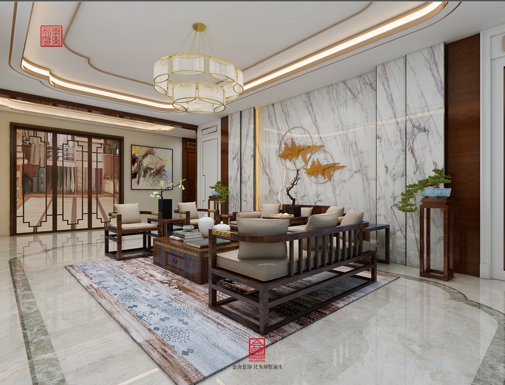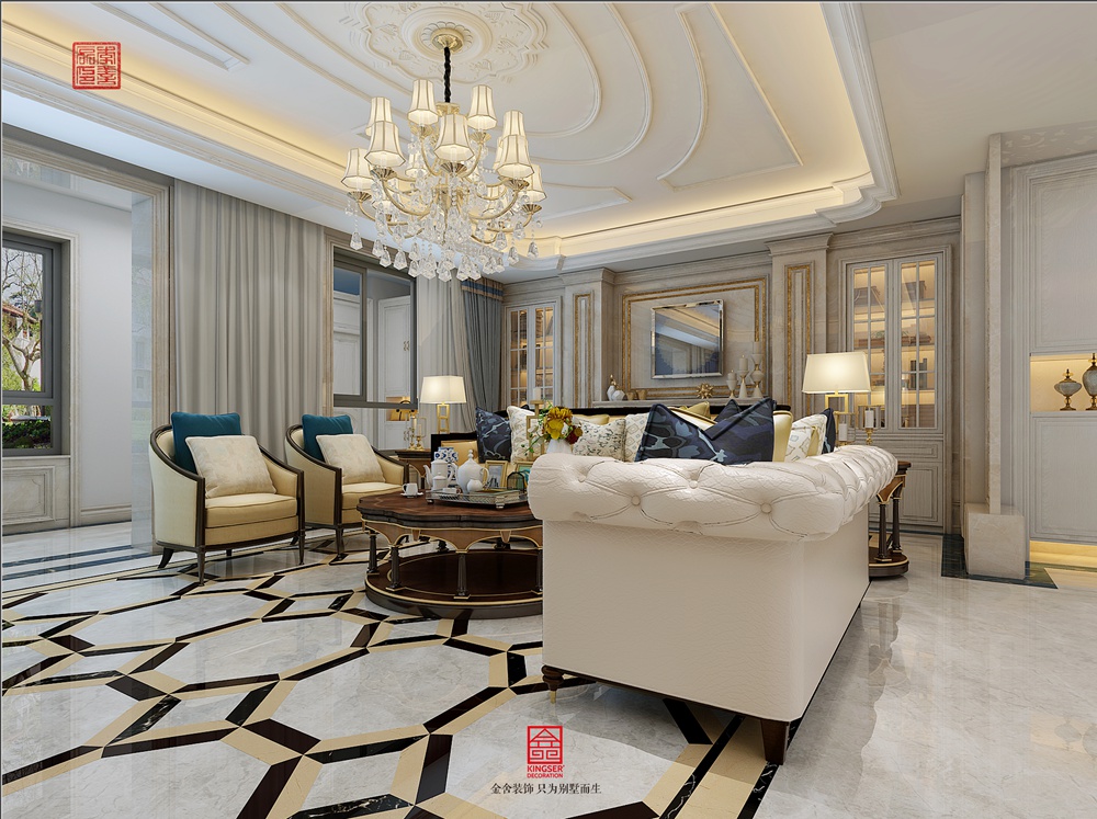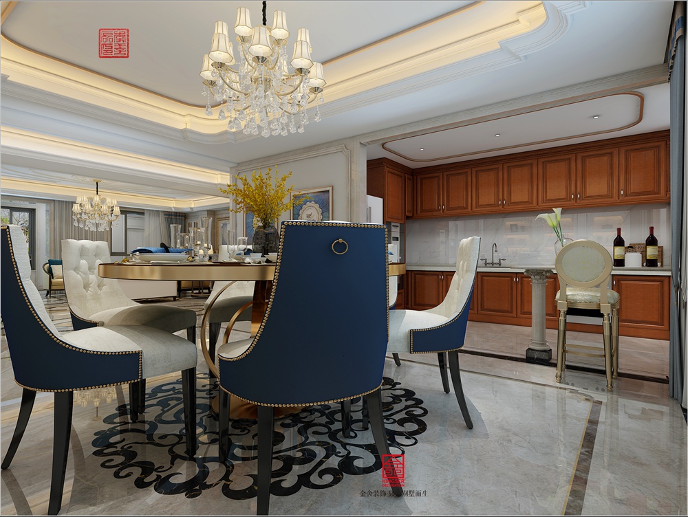 此案例為金舍裝飾-唐城壹零壹280平米混搭風(fēng)格裝修效果圖。色彩上展現(xiàn)出古典美與現(xiàn)代生活文化結(jié)合,以金屬、米色為基調(diào),雅致的霧霾藍、棕色作為點綴,使整個空間更具尊貴感。配合硬裝硬朗的材質(zhì)和明快的色調(diào),軟裝點綴雅致的配飾,賦予空間沉穩(wěn)、典雅的神韻。