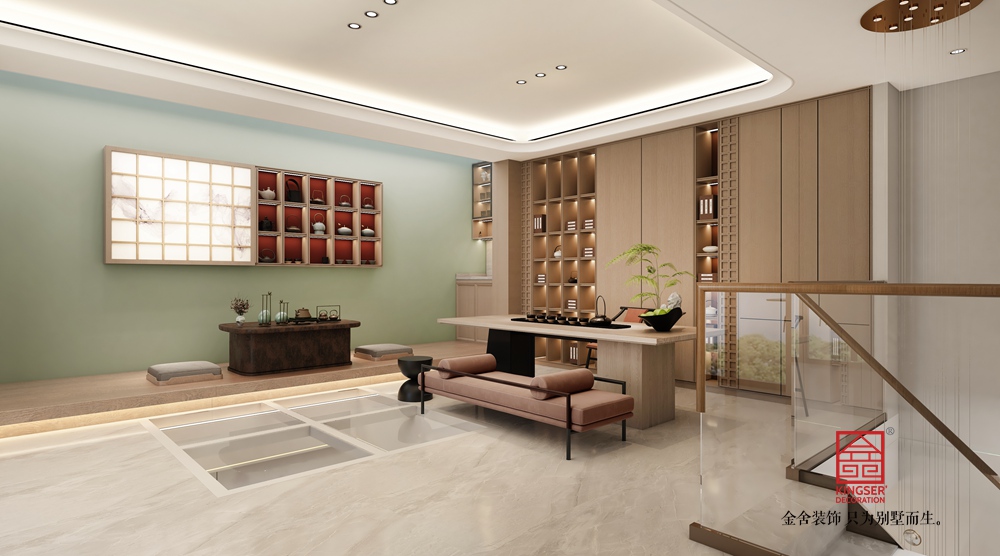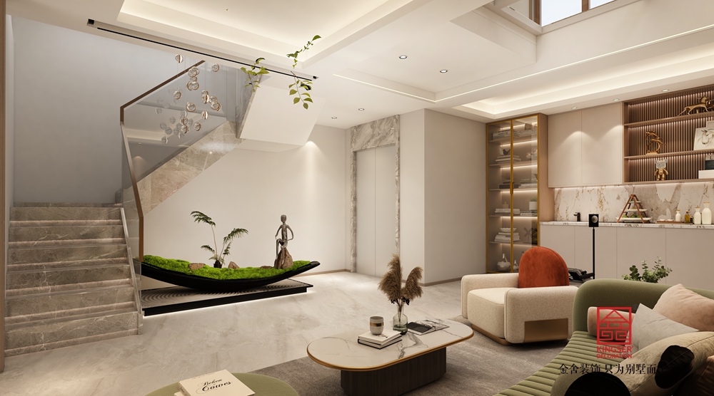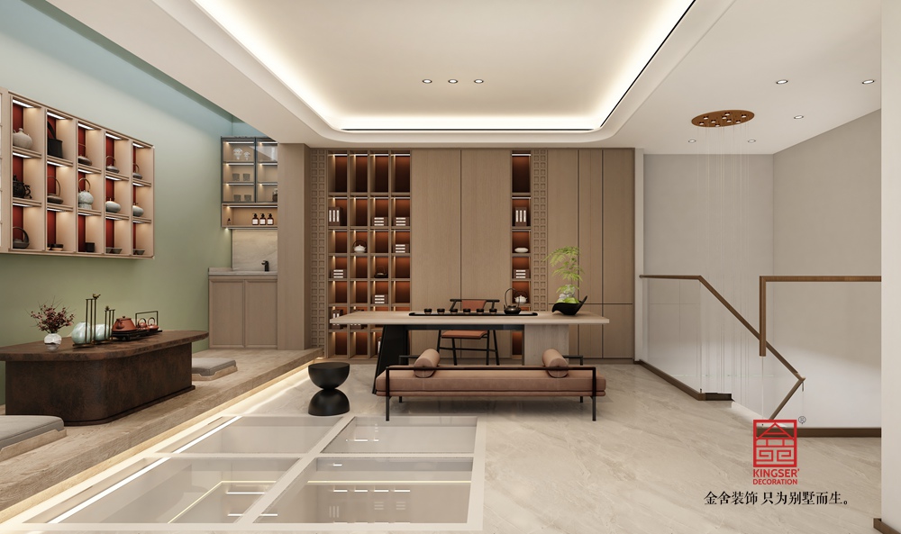 設計說明: 此案例為石家莊裝修公司-桃花源260平米新中式風格裝修效果圖。米色和棕色作為主色調,共同營造了一種溫馨而沉穩的氛圍。米色墻面和天花板提供了明亮的背景,使得整個空間顯得寬敞而通透;而棕色的木質書架、沙發以及帶有圓形圖案的墻面,則增添了空間的層次感和深度。這種色彩搭配不僅和諧統一,還通過材質的不同質感形成了微妙的對比,提升了空間的視覺豐富度。