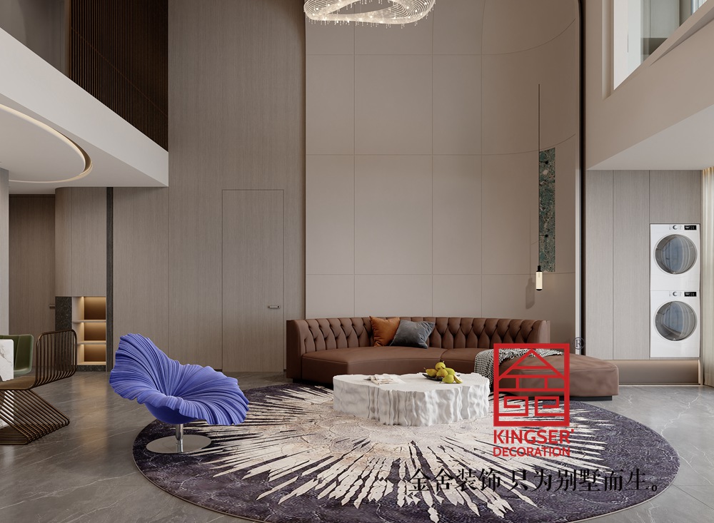 客廳的色彩搭配以棕色和米色為主,這兩種顏色相互搭配,既體現了現代風格的簡約與時尚,又營造出一種溫馨、舒適的環境。藍色的單人沙發和橙色、灰色的抱枕作為點綴,增添了空間的活力和層次感。