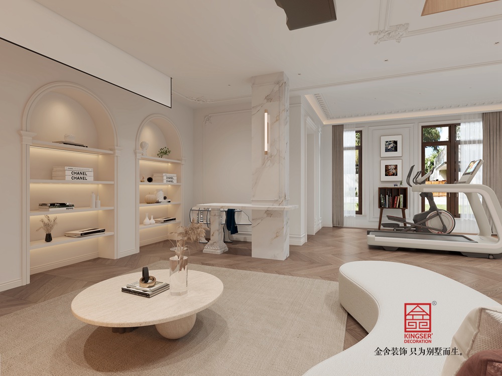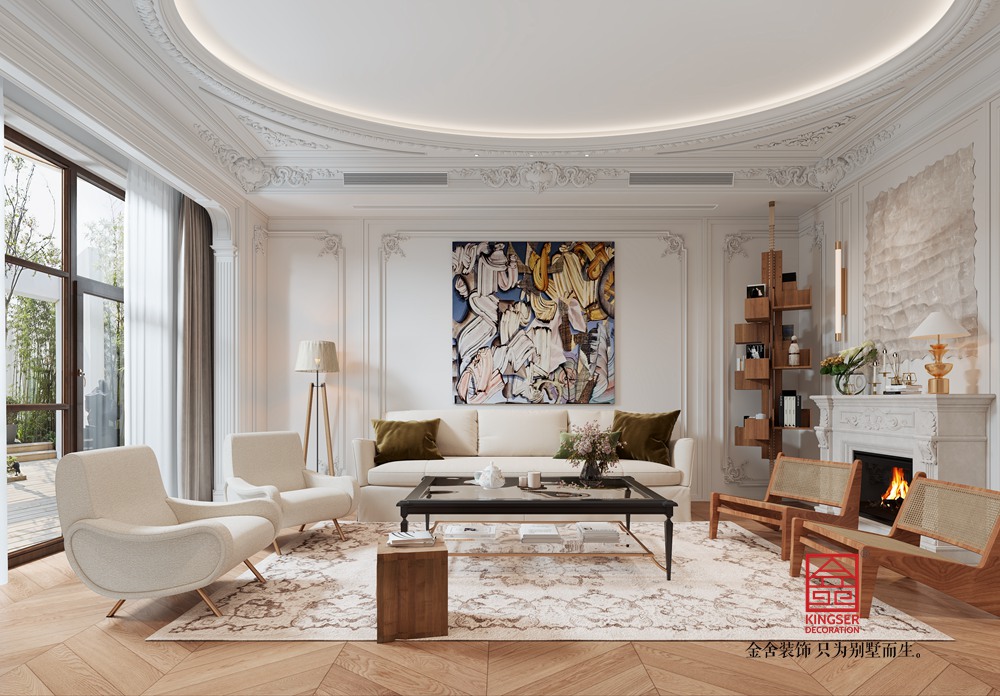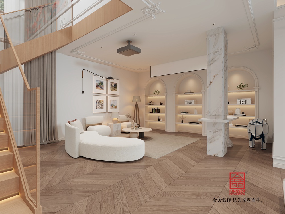 此案例為石家莊裝修公司-西山林語260平米輕奢風格裝修效果圖。本設計方案旨在打造一個現代風格的客廳空間,以白色為主色調,營造出一種簡約而不失溫馨的氛圍。客廳的地面采用木質地板,不僅增添了自然質感,也提升了整個空間的舒適度。