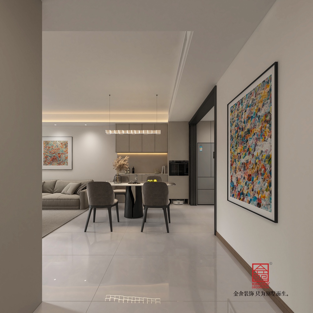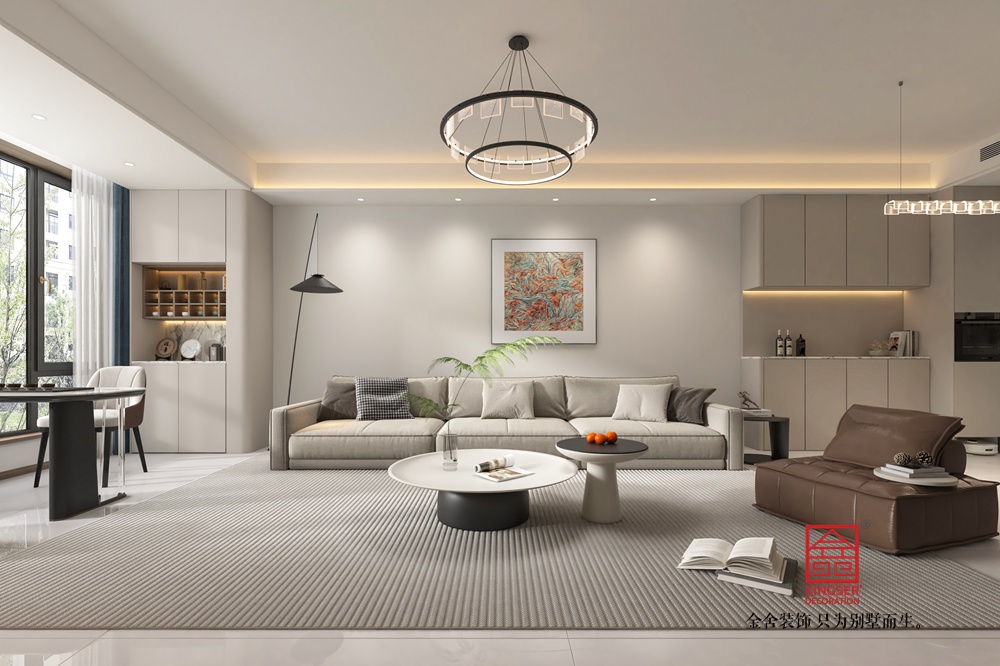 在家具布局上,我們注重了舒適性和實用性。大沙發(fā)和單人沙發(fā)的擺放,既滿足了家庭成員的休息需求,又便于交流和互動。咖啡桌的圓形設(shè)計,不僅美觀大方,還便于放置物品和進(jìn)行小范圍的聚會活動。此外,開放式廚房的設(shè)計,使得烹飪和用餐更加方便,同時也增強(qiáng)了空間的通透感和互動性。