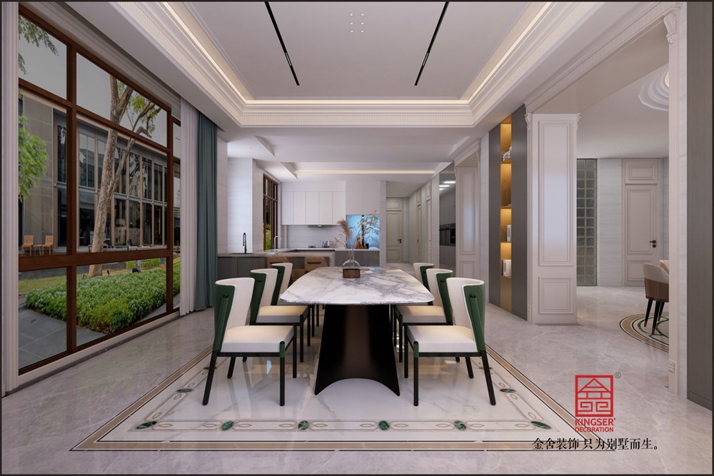 客廳內部裝飾豪華,以白色和米色為主色調。客廳中央有一張大型的白色沙發,沙發上鋪有灰色的抱枕。沙發旁邊是一張長方形的木質茶幾,上面擺放著一些裝飾品和書籍。在沙發對面,有一個帶有玻璃門的壁爐,壁爐上方掛著一幅畫。客廳的一側是一個開放式的廚房區域,可以看到一個黑色的鋼琴和一架梯子。整個房間通過大窗戶引入自然光線,窗外是樹木和建筑。天花板上懸掛著一盞圓形吊燈,為空間增添了溫暖的氛圍。整體來看,這個客廳設計寬敞、明亮且具有現代感。