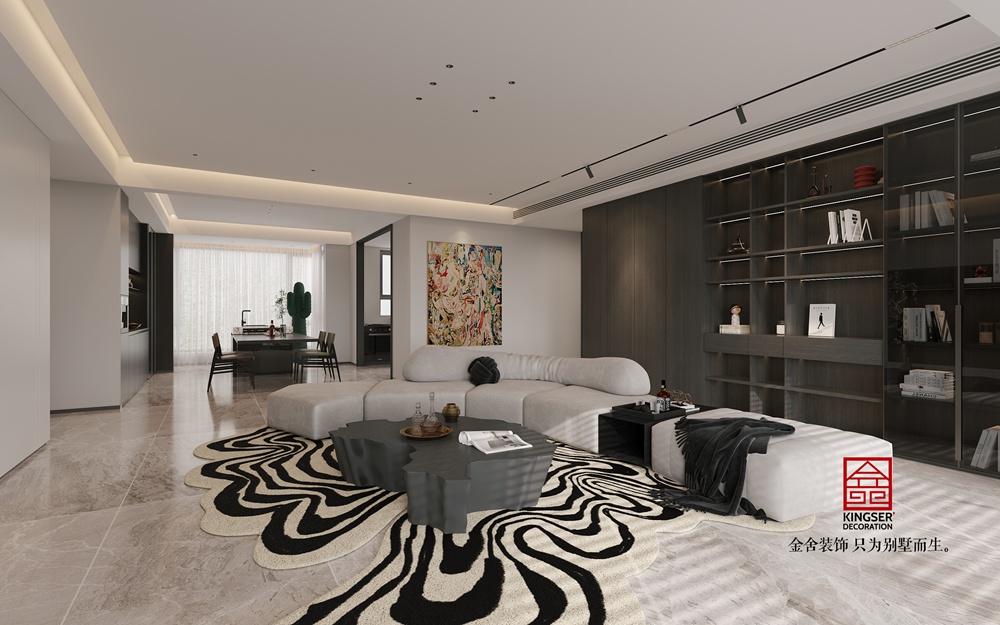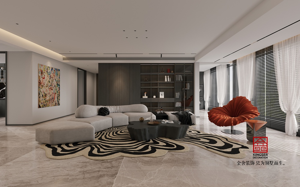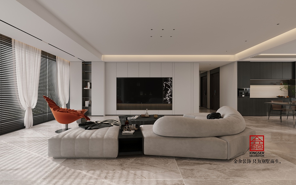本客廳設計以現代簡約風格為主,注重空間的寬敞感和光線的充足性,通過合理的布局和色彩搭配,營造出一種輕松、舒適的生活環境。