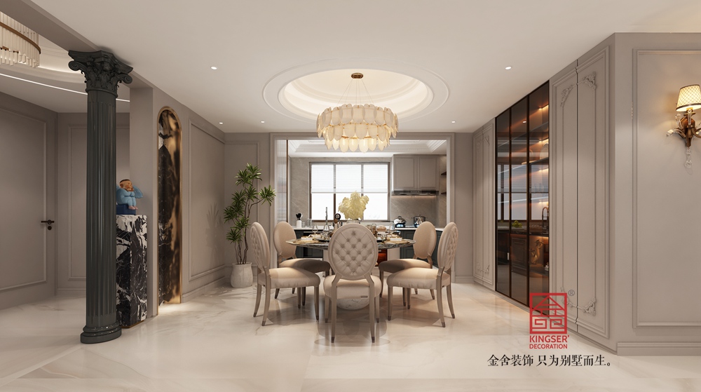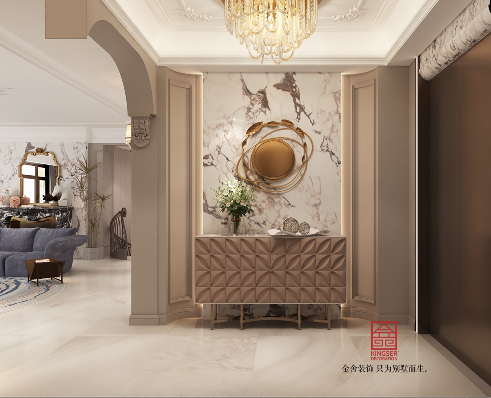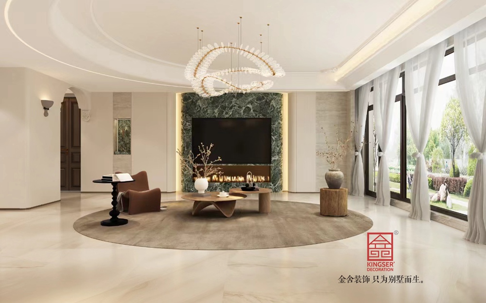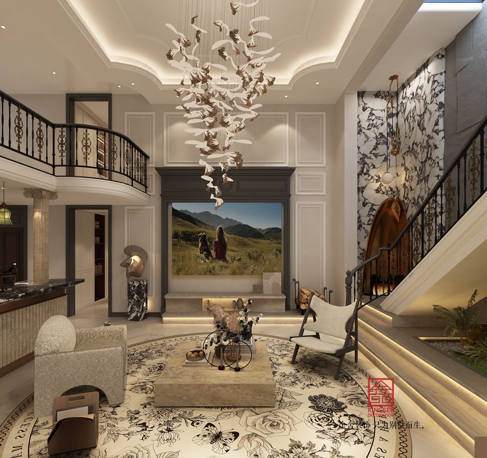 設(shè)計說明: 此案例為金舍裝飾-墻面選用溫潤的墻漆與精致石材,地面以雕花地毯柔化空間,搭配金屬、皮革、布藝等多元材質(zhì)家具,豐富觸覺層次。藝術(shù)吊燈以飛鳥形態(tài)為靈感,成為空間視覺焦點,同時呼應(yīng)自然主題掛畫,傳遞自由、舒展的生活態(tài)度,細(xì)節(jié)處彰顯品質(zhì)與設(shè)計巧思 。