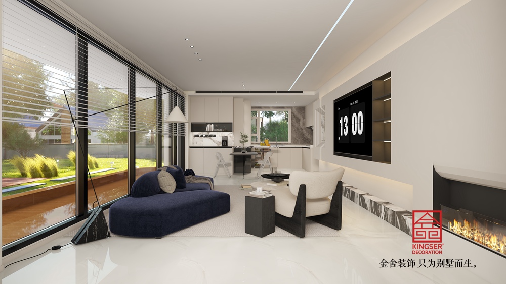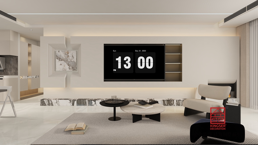 空間布局上,開放式格局模糊空間邊界,客廳與餐廚區自然銜接,增強互動性與通透感 。墻面以純凈白色為主,搭配簡潔幾何造型裝飾,電視墻嵌入收納與顯示功能,既滿足實用需求,又強化秩序感。