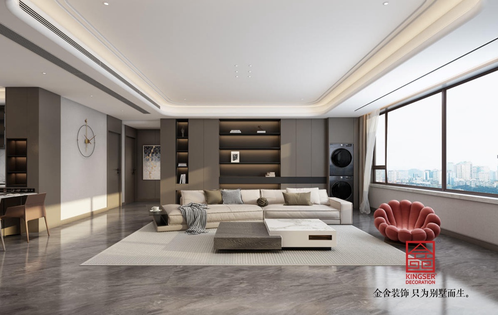 空間布局上,采用開放式設計,讓客廳與周邊區域自然銜接,增強了空間的通透感與互動性。大面積的落地窗是設計亮點,引入充足自然光線,同時將城市景觀納入室內,使空間與外界環境有機融合。