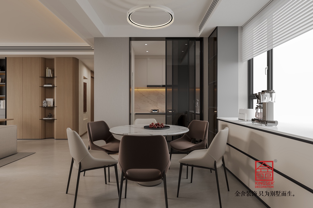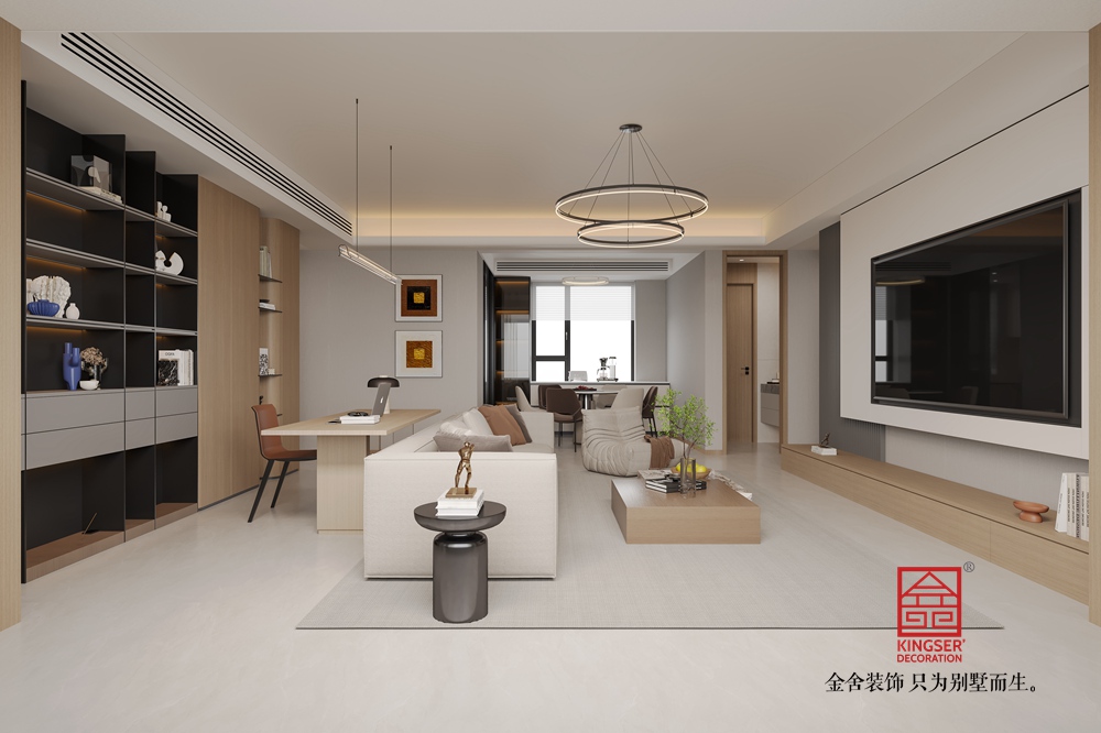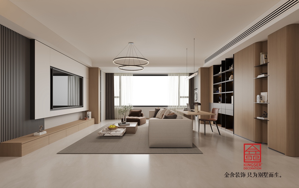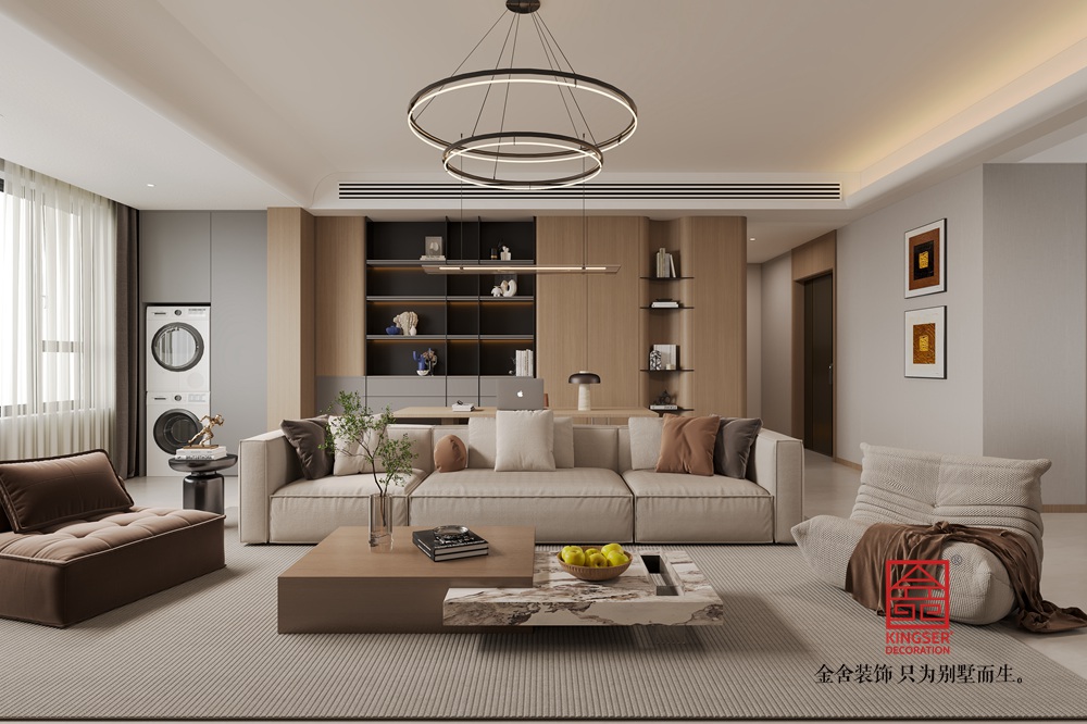 本客廳設(shè)計(jì)以現(xiàn)代簡(jiǎn)約風(fēng)格為核心,主打溫暖柔和的大地色系??臻g布局上,將休閑與功能區(qū)巧妙融合,背景墻處的柜體設(shè)計(jì),兼具收納與展示功能,燈光點(diǎn)綴更顯精致。家具選擇注重舒適與質(zhì)感,淺米色大沙發(fā)搭配棕色系單品,營(yíng)造出溫馨和諧的氛圍。雙層環(huán)形吊燈造型別致,為空間增添時(shí)尚感。整體通過(guò)材質(zhì)、色彩與燈光的搭配,打造出一個(gè)舒適、雅致且充滿生活氣息的別墅起居空間。
