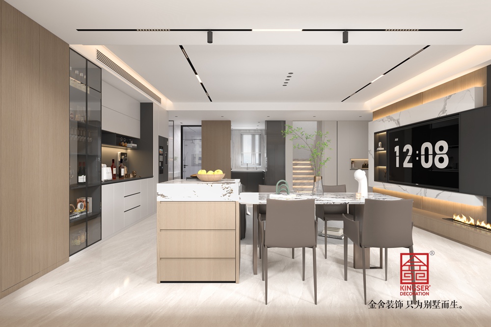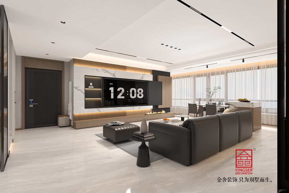 電視背景墻設(shè)計頗具亮點,大理石紋理與木質(zhì)線條結(jié)合,輔以暗藏燈帶,既顯高級質(zhì)感,又通過光影增強了空間的溫馨感。家具選擇注重線條簡潔與材質(zhì)質(zhì)感,淺灰地毯柔化空間,各式桌椅、邊幾等造型簡約卻不失精致,為空間增添了時尚氣息。