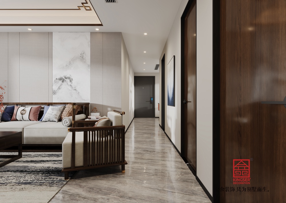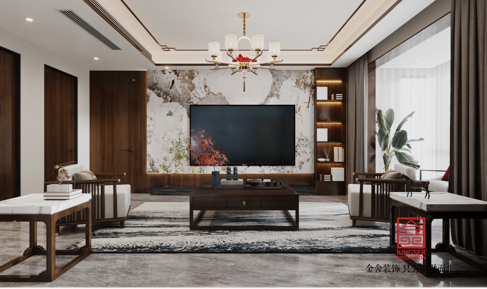 本客廳采用新中式風(fēng)格設(shè)計,將傳統(tǒng)中式元素與現(xiàn)代生活需求巧妙融合。以沉穩(wěn)的木色為基底,搭配大理石紋理墻面,既顯中式的典雅厚重,又添現(xiàn)代的精致感。