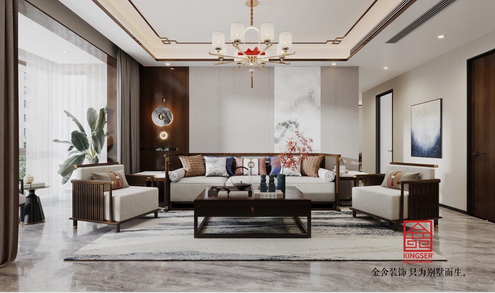家具造型簡約大氣,線條流暢,實木框架與舒適軟墊結(jié)合,兼顧中式韻味與使用舒適度。中式吊燈、精致擺件以及綠植點綴,為空間注入文化氣息與自然生機。大窗戶引入充足自然光,讓室內(nèi)外景致相互呼應(yīng),營造出雅致、舒適且富有格調(diào)的居家氛圍,盡顯新中式風(fēng)格的獨特魅力。