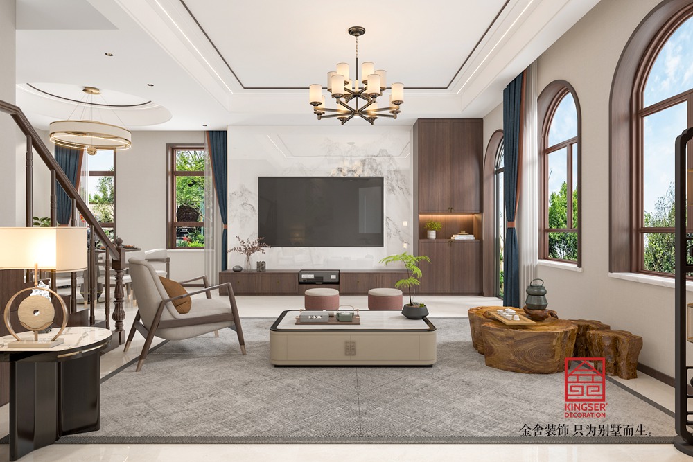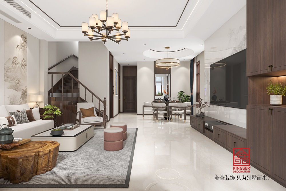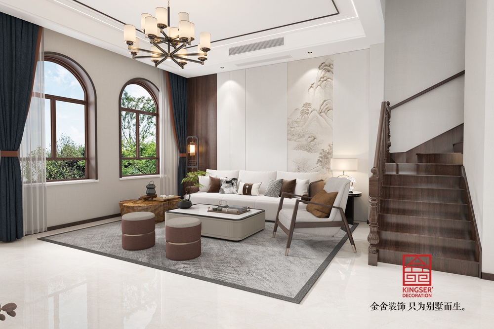 本設計以新中式風格為核心,打造出兼具東方雅致與現代舒適的別墅客廳空間。