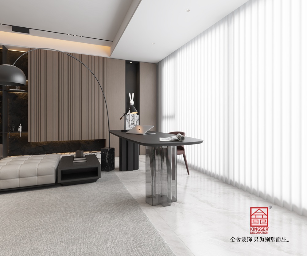 空間布局上,開放式設計模糊了功能區邊界,讓客廳與周邊區域形成自然互動。無主燈照明系統結合線性燈帶與嵌入式筒燈,營造出柔和且富有層次的光影效果,進一步提升了空間的高級氛圍。整體設計通過材質的細膩對比(如大理石的冷冽、皮革的溫潤、地毯的柔軟)與色彩的和諧搭配,詮釋了現代別墅生活的精致與從容,展現出 “簡約不簡單,奢華不張揚” 的設計哲學。
