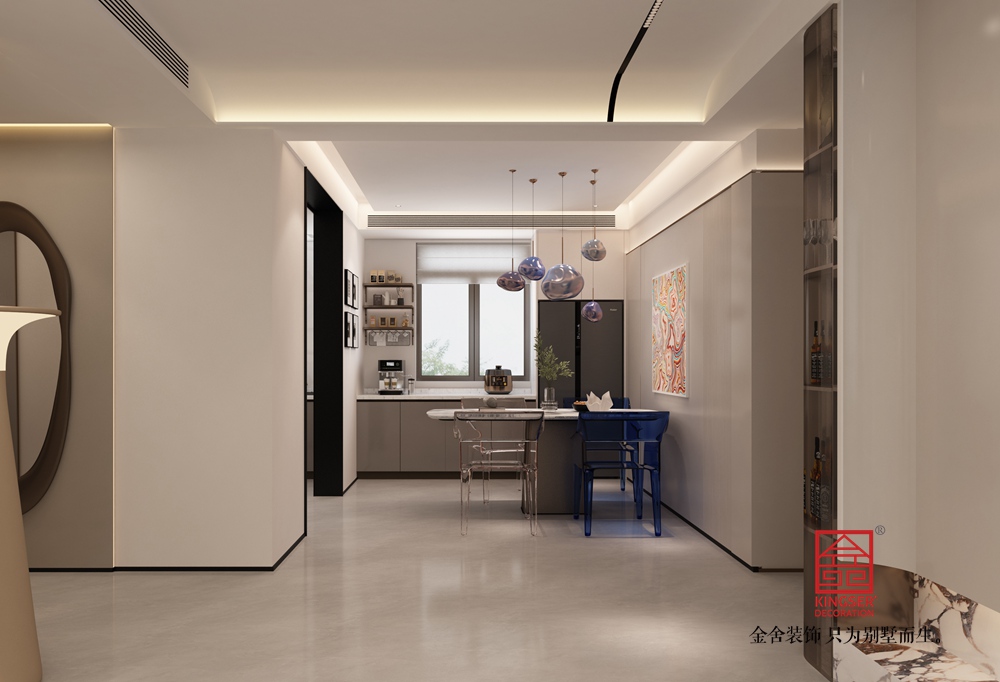 設計說明:這個客廳以 “現代輕奢 + 簡約松弛” 為核心調性,采用開放式格局銜接客餐廳與家政區,用通透玻璃柜做軟隔斷,既保障空間通透感又兼顧收納展示功能;主色調以低飽和米白、淺灰鋪陳,搭配大理石地臺的自然紋理與金屬線條點綴,再以紅色單人椅、藍色餐椅作跳色提亮,質感與靈動感兼具;細節上,懸浮電視柜 + 嵌入式燈光弱化厚重感,家政區藏于柜面后實現功能與美觀的平衡,異形地毯與藝術掛畫則為簡約空間注入藝術氛圍,整體呈現出 “好看又好住” 的輕奢質感,適配追求精致與松弛生活的需求。