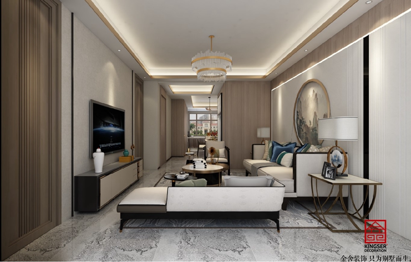 設計說明:中國傳統居室非常講究空間的層次感,這種傳統的審美觀念在“新中式”裝飾風格中,又得到了全新的闡釋。依據住宅使用人數和私密程度的不同,需要做出分隔的功能性空間,則采用“埡口”或簡約化的“博古架” 來區分;在需要隔絕視線的地方,則使用中式的屏風或窗欞,通過這種新的分隔方式,單元式住宅就展現出中式家居的層次之美。