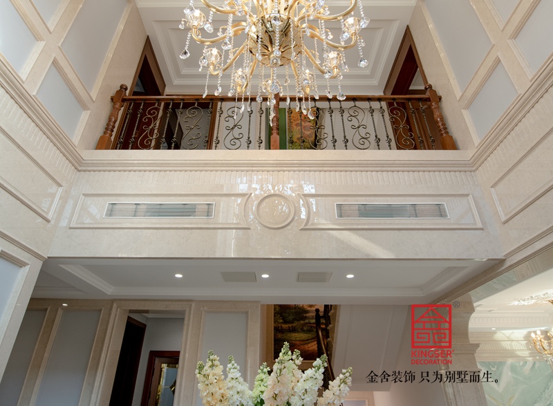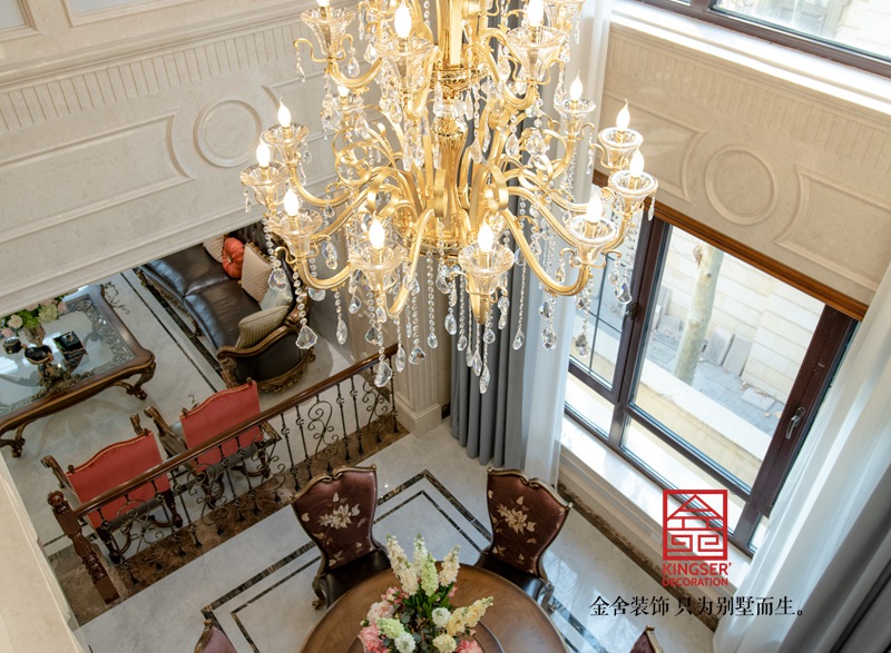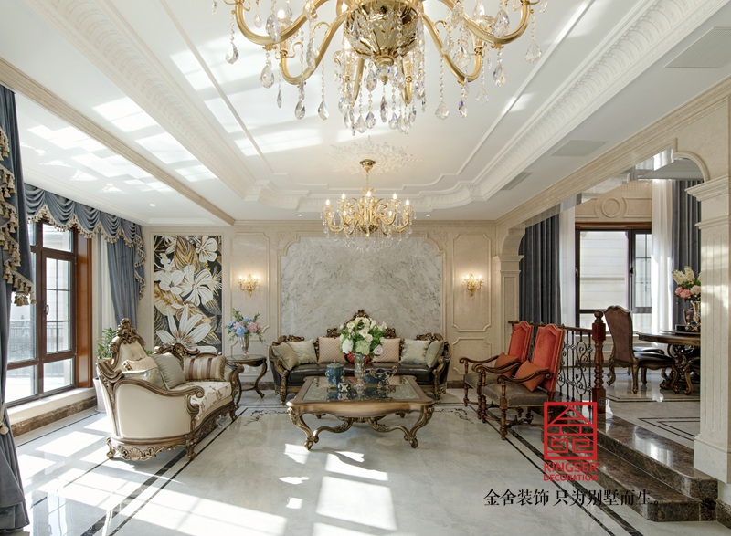 一樓客廳多用淺灰色瓷磚,用拼花分割區域,墻面用米色石材鏤空墻板,頂面加入法式線條及法式雕花燈盤顏色明亮線條優美靈動。家具是美式實木質地以法式形態展現創新不失莊重。