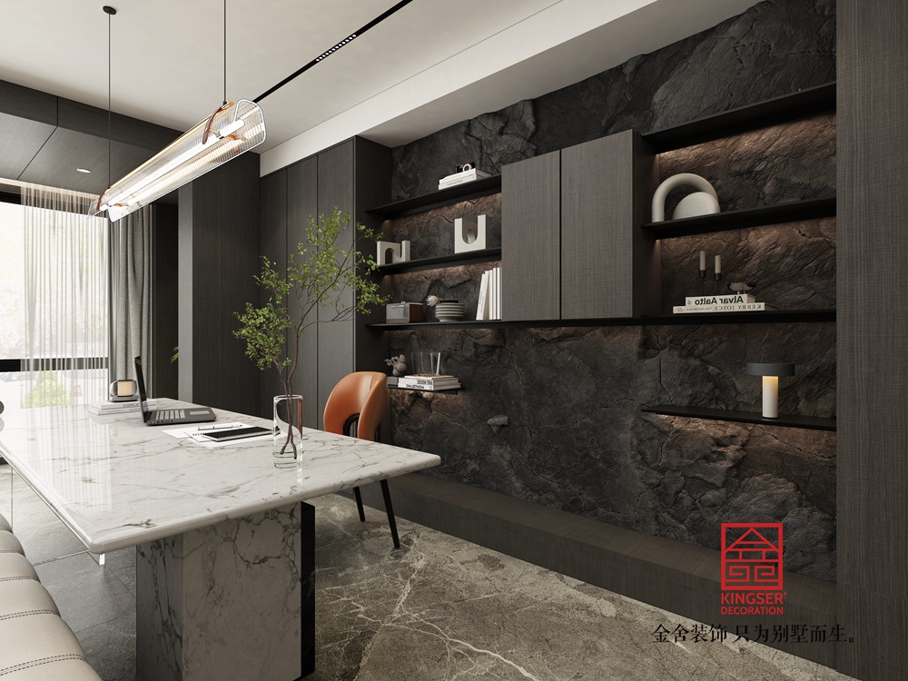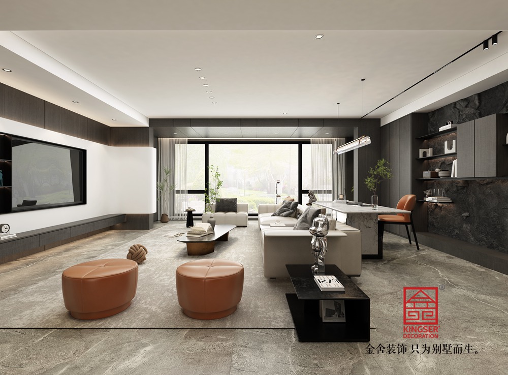 設計說明:此案例為金舍裝飾-利航棠樾府265平米意式極簡風格裝修效果圖。風格搭配上,以低飽和度色調為主打,黑白灰色的經典運用,將整體居室表現的簡單明朗充滿層次感,地板、墻面都以統一色調進行搭配,在材質與風格之間靈活應用,讓整體空間混為一體,保持高度一體化,使整個空間泛著輕奢的高級感。
