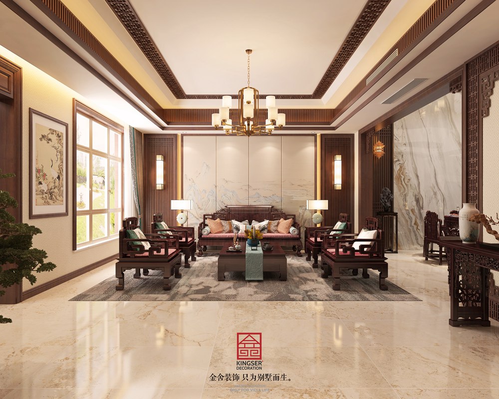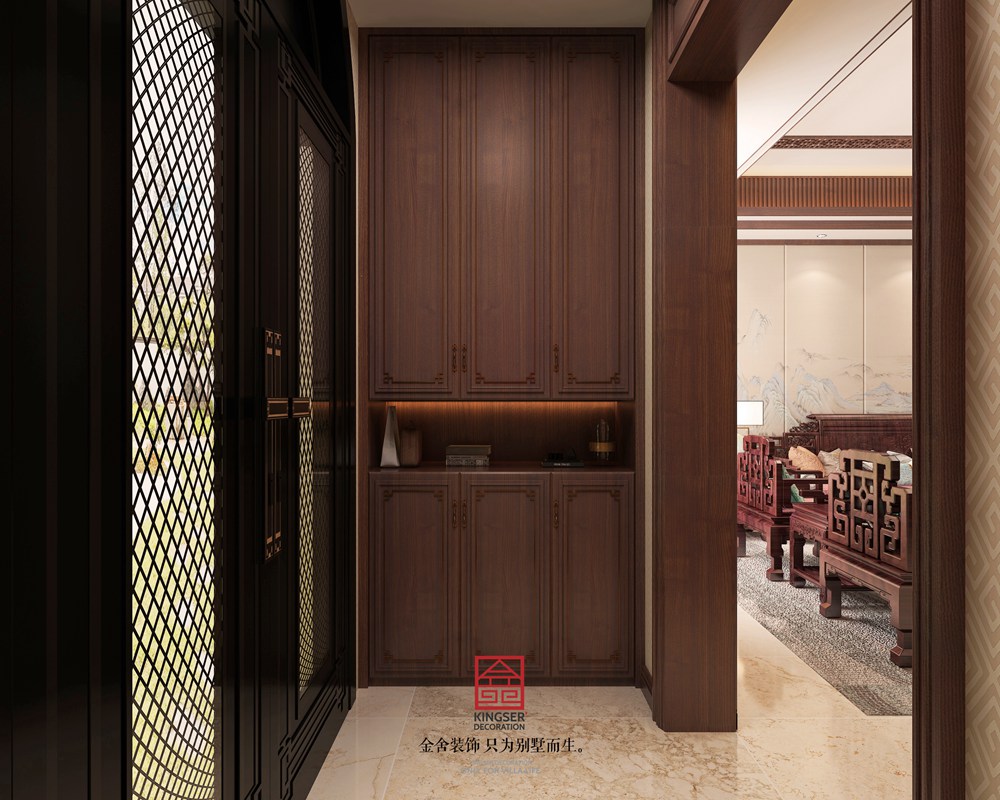 整體挑高保留,并以大面積紅花梨木墻板為主格調,搭配有暈染味道的地磚,素色的壁紙,整個空間端莊大氣,中式圖案打造背景墻使其氣勢磅礴與紅花梨墻板呼應,有種超凡脫俗的感覺。